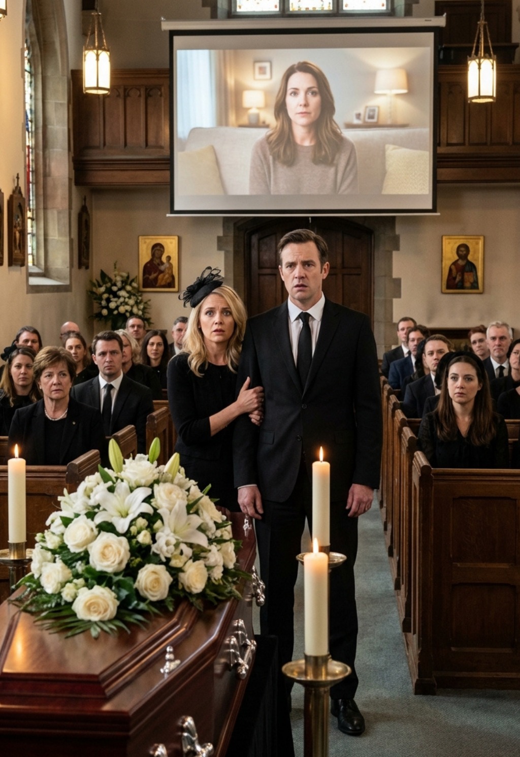 Organistul a greșit o notă, iar tensiunea a crescut. Biserica era decorată cu trandafiri crem și lumânări albe, reflectând gustul rafinat al Mirabellei. Sicriul a rămas închis, simbolizând dorința ei de a păstra misterul chiar și în moarte.