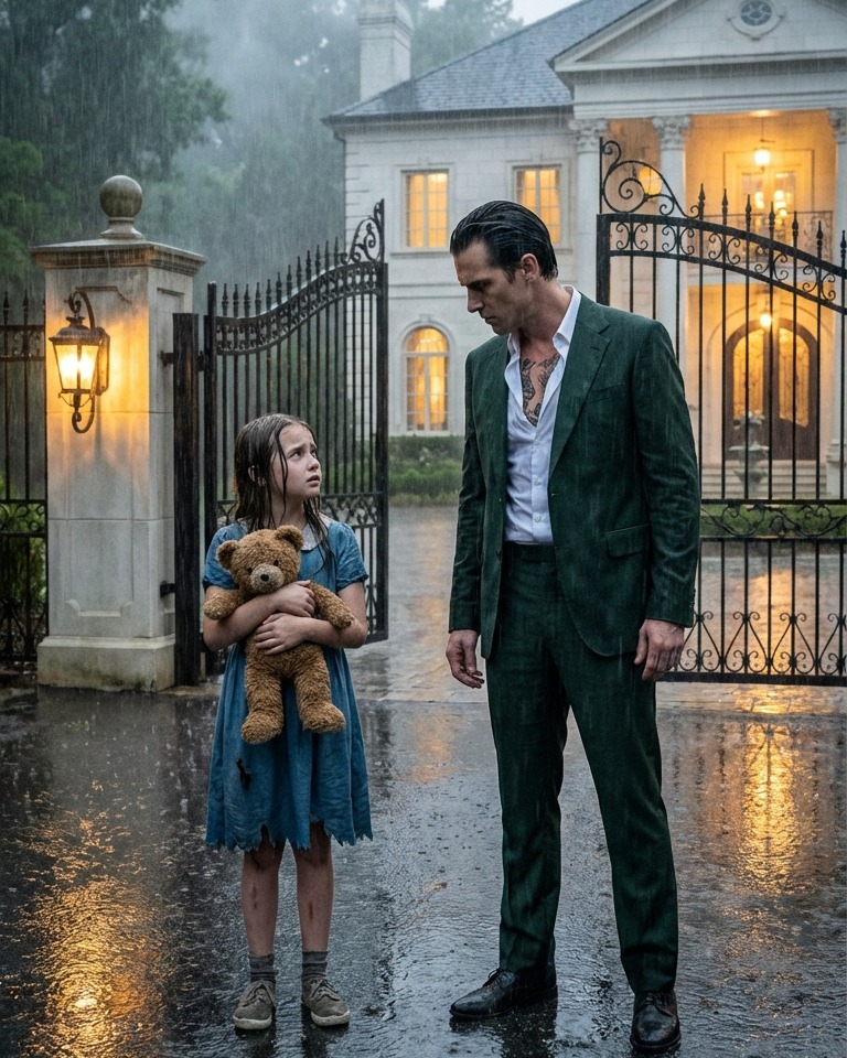 Stătea în fața porților înalte de fier, cu nimic altceva decât un ursuleț de pluș ud și o bucată de hârtie mototolită cu o adresă abia lizibilă prin ploaie. Lily Carter, în vârstă de șase ani, părea incredibil de mică stând la poartă. Buclele îi erau lipite de frunte, iar pantofii îi erau îmbibați cu apă. Degetele ei mici strângeau ursulețul de pluș uzat, căruia îi lipsea un ochișor.