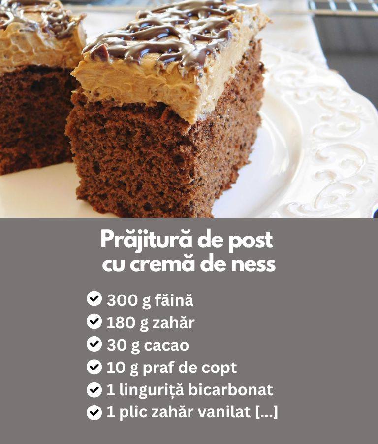 Prăjiturile de post nu trebuie să fie plictisitoare sau lipsite de gust. Această rețetă combină simplitatea cu aroma intensă de ness, oferind un desert care poate fi savurat de toată familia. Fără lactate și ouă, această prăjitură rămâne ușor de digerat și potrivită pentru perioadele de post, dar și pentru cei care preferă deserturi vegane.