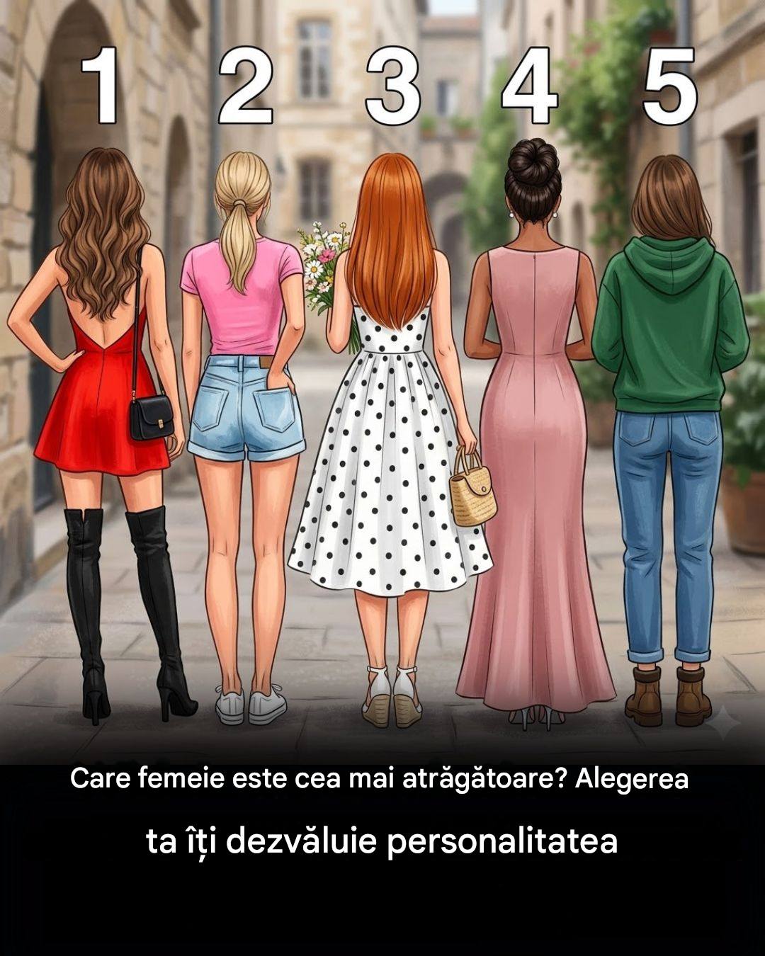 Imaginându-ți cinci femei care stau cu spatele, fiecare având o postură, o ținută și un stil diferit, întrebarea este simplă: care dintre ele crezi că va fi cea mai atrăgătoare atunci când se va întoarce? Această alegere, deși aparent simplă, poate reflecta preferințele tale profunde și aspectele personalității tale.